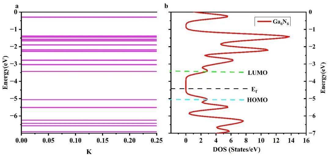 通过对该结构进行态密度分析,作家揭示了Ga₆N₆纳米环的电子结构。在该纳米环的最高占据分子轨说念(HOMO)中,主要由氮原子的2p轨说念孝顺,而最低未占据分子轨说念(LUMO)则主要由镓原子的4p轨说念孝顺。