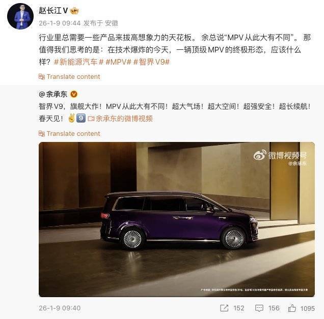 赵长江以谏言著称,刚加盟智界就在微博与余承东互动中暗示“智界V9在异日三年内将难以找到敌手”,激励不少反响。
