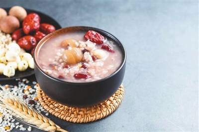 红枣10枚,桂圆10枚,枸杞子10克,粳米100克,熬粥饮用。
